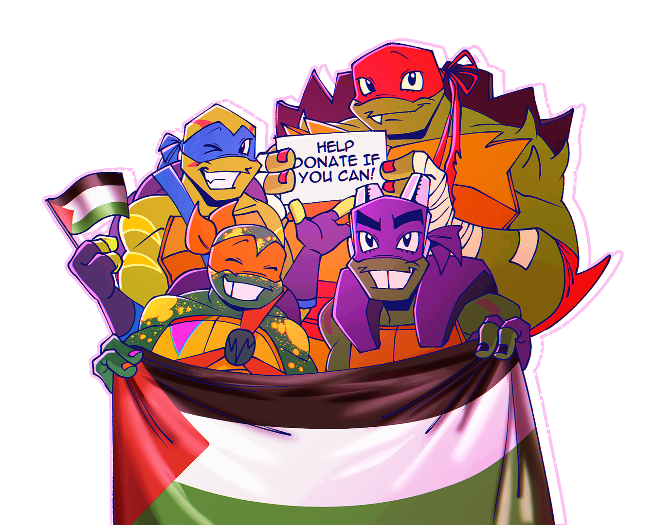 TMNT4P is a group for raising money for IMEU, a nonprofit which focuses on sharing accurate and up-to-date information on Palestine with journalists and maintaining a record of Palestinian culture and history. We'll be donating money for this cause and giving back commissions to those who donate.